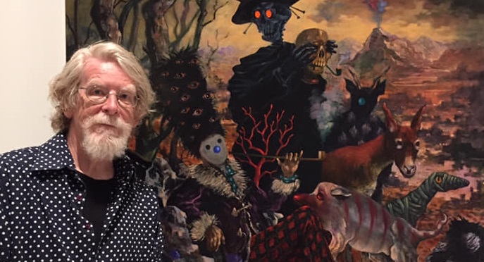 At an early age Vale was attracted to the music and poetry of Bob Dylan, and John Lennon’s ethos; there might also have been some interest in the style and freedom of the classic jazz icons of different times and places. His interests were always in figurative art, and the images from music and literature fed into the visual mix. But absurdism, surrealism and especially the works of James Ensor, the eccentric and influential Nineteenth Century Belgian artist, have held a life-long interest. Figurative imagery from the B-grade horror movies of the mid-Twentieth Century, delivered with strong representational skills and sheer visual proficiency, also fed his love of “a sense of the impossible… the fine line between horror and humour”